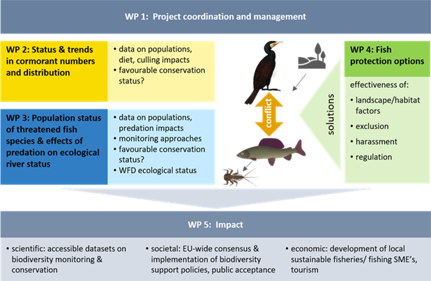 The ProtectFish Consortium writes that “for a great migratory species such as the cormorant co-created management measures – developed in close cooperation between scientists, NGOs, river managers and other stakeholders such as the angling community – may improve biodiversity, boost the ecosystem-services rendered by freshwater ecosystems while reducing societal conflicts.” Through its research, the ProtectFish project aims to identify potential policy options to improve the management of EU-listed fish populations and Great Cormorant populations.