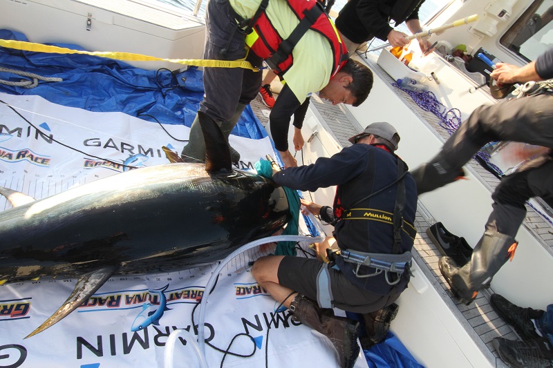 This year, more than 30 fish were tagged in total. The fishing was performed with rod and hook, which is considered to be the best method for tag and release of these large individuals. The tags were applied by a tagging expert following the method recommended by the International Commission for the Conservation of Atlantic Tunas (ICCAT). Also, two different kinds of tags were used. The first one is an acoustic transmitter that actively transmits signals to an underwater hydrophone. The other tag is logging different data over time. The tag is then released from the fish after a certain amount of time, generally one year, and sends the collected data directly via satellite to a database. ICCAT can then use the data for the assessment of the stocks.